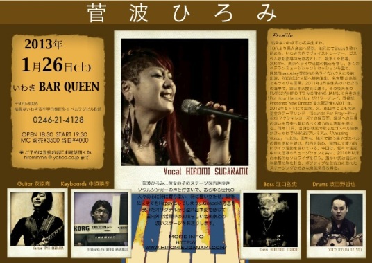 ■菅波ひろみ Profile■ 福島県いわき市小名浜生まれ。みずがめ座。 深川・辰巳芸者の血を受け継ぐ。 10代後半から黒人音楽に魅せられ、Bluesを歌い始める。 地元いわき市及び県内外で、ヴォイストレーナーとして活躍、併せてゴスペル歌唱指導インストラクターとして、多くのグループ、イベントプロデュースを手掛ける。 2004年に活動の拠点を東京に移し、ベテランミュージシャンとセッションを重ね、高円寺ジロキチ、荻窪ROOSTER、目黒Blues Alley Japanなど多くの名店に出演。 併せて、2003年には、ニューオリンズの地元フェスティバルに参加、2004年にはChicago Gospel Choirと共演、2011年にはミネアポリスにてThe Sounds Of Blacknessとのワークショップで交流を計るなど、渡米を重ね音楽のルーツにあるブラックミュージックを探求。 2008年より関西中部地方に進出、ライヴ活動を展開。 2011年3月11日、いわき岩間海岸で、東日本大震災に遭う。 大阪のFM802内”Hiro T's Jam" 内にて自身の曲『Put Your Hands Up』が、看板DJヒロ寺平氏によって大プッシュパワープレイ。 同年5月、異例の、無名アーティスト曲が同FM月間総合ランキングにて21位にまで上昇。 2011年4月、2012年4月と、FM802主催『New Breeze』@大阪野外音楽堂に立つ。 311以降は、関西発のSounds for prayによる”Colors-絆―)に参加の他、フクシマレコーズへの録音に取り組む。 温かく力強い歌声と佇まいとその歌詞は、年代を越え、多くの日本人の心に沁み込んでゆく。