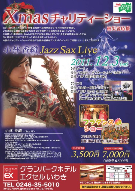このチャリティーディナーショーは2回目で、 1回目は去る7月に、この企画を深くご理解頂いた「シャンソン歌手の暖みえこさん」と 地元で活躍する「永山久夫とアロハローガンズ&フラガール」の2組の方々が出演し、 その後、富岡高校の皆様にバイキングを楽しんで頂きました。 今回は双葉高校の皆様をお招きしたいと企画しました。 半年に1回のペースで企画できればと思っております。 今回はこの企画に深く共感し快く出演を承諾して下さった超人気サックス奏者の「小林香織」さんをスペシャルゲストにお迎えします。 そしてオープニングアクトに地元ハワイアンバンド「永山久夫とアロハローガンズ&フラガール」の皆様に出演頂きます。