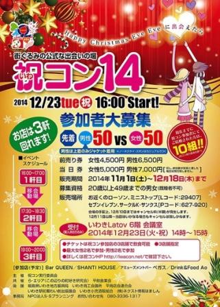 集合場所: いわきラトブ6F(会議室) 集合時間: 14時〜15時 開催場所: Bar QUEEN/SHANTI HOUSE/ Drink&Food Ao/アミューズメントバー ベガス 開催時間: 16時00分 スタート 販売期間: 2014年11月1日(土)〜12月18日(木)まで 募集人数: 男性50名 VS 女性50名 募集資格: 未婚者で20歳後半から49歳代の男女 前売り券: 男性6.500円 女性4.500円 先着順 (当日券+500円) 販売場所: お近くのローソン・ミニストップ チケットぴあ ローソン 【Lコード:29407】 ミニストップ 【Lコード:29407】 チケットぴあ 【Pコード:627-920】 |