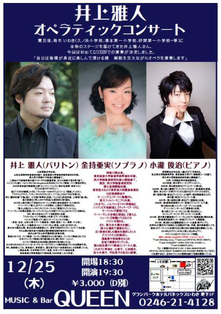 震災後、毎年 いわき(久ノ浜小学校、湯本第一小学校、好間第一小学校・・・等)に 本物のオペラを届けてきた井上雅人さん。 例年 学校へのお届けでしたが、今回は初めてQUEENでの演奏を企画しました。 「当日は皆様が身近に楽しんで頂ける様 解説を交えながらオペラを演奏します」