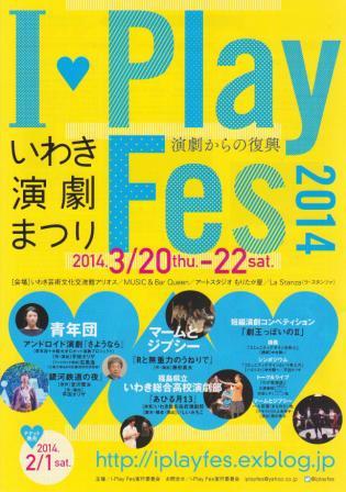 ^^^^^^^^^^^^^^^^^^^^^^^^^^^^^^^^^^^^^^^^^^^^ この度、昨年に引き続き、I-Play Fes2014を開催することとなりました。 あの震災からもうすぐ3年。いわきは道路の凹みが少しだけ修まり、危険構造物に指定された建物がようやく取り壊され、 更地になった場所にどんどんアパートが建てられています。あちこちにある仮設住宅の利用期間も延長されました。 このいわきにずっと住んでいた人。避難して外から入ってきた人。復興の仕事で外から入ってきた人。 いわきから元の家に帰れた人。帰りたくても帰れない人。帰らないことを選んだ人。 様々な思いを抱えたこの街、いわきで開催するI-Play Fes 2014のテーマは文化芸術によるコミュニティの再生です。 フェスティバルでは、青年団、マームとジプシーの上演やコミュニティデザインについての講義やシンポジウムを開催。 さらに、審査委員長に平田オリザ氏を迎え、いわき・福島で活動する劇団による短編演劇コンペティション「劇王っぽいの」を 昨年に引き続き開催します。 そのほか、トーク&ライブ『わが星夜話』やいわき総合高校の上演など、この3年を振り返ると共に、 企画運営に中高生ディレクターズを迎え、いわきの未来の担い手を育成していく活動も行います。 芸術文化による復興への歩み、2歩目にお立ちあいいただければ幸いです。 みなさまのご来場を心からお待ち申し上げております。 2014年1月吉日 I-Play Fes実行委員会