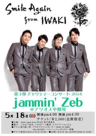 いわきアリオス・中劇場で『Smile Again from Iwaki チャリティーコンサート第3弾 jammin'Zeb』が開催されます!