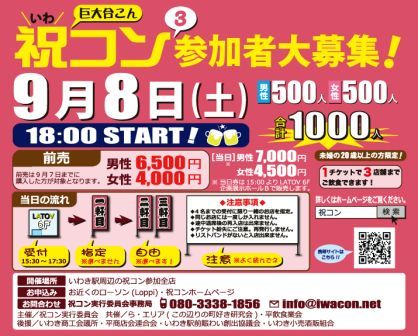 Æü»þ2012ǯ9·î8Æü(ÅÚ) ¼õÉÕ¤Ï15:30¡Á17:30¡¢¥¹¥¿¡¼¥È¤Ï18:00¤Ç¤¹¡£ 1»þ´ÖÆþÂØÀ©¤ò1¥é¥¦¥ó¥É¤È¤·¡¢3¥é¥¦¥ó¥É¤Ç¼Â»Ü¤·¤Þ¤¹¡£ ¥¿¥¤¥à¥¹¥±¥¸¥å¡¼¥ë¡Ú1ŹÊÞÌÜ¡Û18:00¡Á19:00 ¡Ú2ŹÊÞÌÜ¡Û19:30¡Á20:30 ¡Ú3ŹÊÞÌÜ¡Û21:00¡Á22:00(¥¤¥Ù¥ó¥È½ªÎ») ¢£30ʬ´Ö¤Î¥Ð¥Ã¥·¥ó¥°¥¿¥¤¥à¤òÀßÄꤷ¡¢¥Æ¡¼¥Ö¥ë¤ÎÊÒÉÕ¤±¤äÎÁÍýÅù¤Î½àÈ÷¤ò¤·¤Þ¤¹¡£ ¡¡¡¡»²²Ã¼Ô¤Î³§¤µ¤ó¤Ï¼¡¤Î¤ªÅ¹¤Ø°Üư¤·¤¿¤ê¡¢°ì½ï¤Ë°û¤ß¤Ë¹Ô¤¯¿Í¤ò¸«¤Ä¤±¤Æ¤¯¤À¤µ¤¤¡£ ¢£»²²Ã¤µ¤ì¤ëÊý¤Ï¡¢¤è¤ê¿¤¯¤Î¿Í¤È¤Î½Ð²ñ¤¤¤òÍ¥À褵¤»¤Æ¤¯¤À¤µ¤¤¡£ ¼õÉÕ¾ì½êLATOV 6F ´ë²èŸ¼¨¥Û¡¼¥ëB ÅöÆüËÜÉô¤¤¤ï¤±ØÁ° ¥Ý¥ì¥Ý¥ì¤¤¤ï¤1FÆâ¤Ë½Ë¥³¥óËÜÉôÀßÃÖ ²ñ¾ì»²²ÃʰìÍ÷¡¦¥Þ¥Ã¥×¤Ï¤³¤Á¤é¤ò»²¾È¤·¤Æ²¼¤µ¤¤¡£ »²²Ã»ñ³Ê̤º§¤Î20ºÐ°Ê¾å¤ÎÃ˽÷¤Ç¤¢¤ì¤Ð¤É¤Ê¤¿¤Ç¤â·ë¹½¤Ç¤¹¡£ ¢£¤ª´ê¤¤ ³Ú¤·¤¤¥¤¥Ù¥ó¥È¤Ë¤¹¤ë¤¿¤á¤Ë°Ê²¼¤Î»ö¤ò¤ª¼é¤ê¤¯¤À¤µ¤¤¡£ ¡¦¥¤¥Ù¥ó¥È¸å¤Î°û¼ò±¿Å¾¤Ï¤·¤Ê¤¤¤Ç¤¯¤À¤µ¤¤¡£Ëü°ì¡¢»ö¸Î¤Ë¤¢¤Ã¤¿¾ì¹ç¡¢¼«¸ÊÀÕǤ¤Ç¤ª´ê¤¤Ãפ·¤Þ¤¹¡£ ¡¦¥¤¥Ù¥ó¥ÈÃæ¤Î°Üư¤ä¡¢¤½¤Î¾¤ÎÍ×°ø¤Ëȼ¤¦Å¾ÅÝ¡¢²ø²æÅù¤¬¤¢¤Ã¤¿¾ì¹ç¡¢¼«¸ÊÀÕǤ¤Ç¤ª´ê¤¤Ãפ·¤Þ¤¹¡£ ¡¦¥¤¥Ù¥ó¥ÈÃæ¤Î´ïʪÇË»Åù¡¢Ë¡Î§¤ËÈ¿¤¹¤ë¹Ô°Ù¤ò¤È¤Ã¤¿¾ì¹ç¤Ï¡¢¼«¸ÊÀÕǤ¤Ç¤ª´ê¤¤Ãפ·¤Þ¤¹¡£ ¢¨¥È¥é¥Ö¥ë¤Ë´Ø¤·¤Æ¡¢½Ë¥³¥ó¼Â¹Ô°Ñ°÷²ñ¤Ç¤Ï°ìÀÚ¤ÎÀÕǤ¤ÏÉ餤¤«¤Í¤Þ¤¹¤Î¤Çͽ¤á¤´Î»¾µ¤¯¤À¤µ¤¤¡£ »²²ÃÈñÍÑ ÃËÀ ½÷À Á°Çä 6,500±ß 4,000±ß ÅöÆü 7,000±ß 4,500±ß